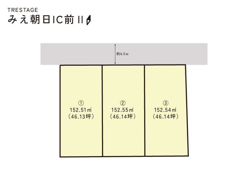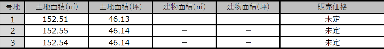 ■トレステージみえ朝日IC前Ⅱ概要 ●所在地/三重県四日市市広永町字向山647-296他●交通/三岐鉄道三岐線「大矢知」駅・・・約1700m(徒歩約22分)●地目/宅地 ●用途地域/第1種中高層住居専用地域●建ぺい率/60%●容積率/200%●道路幅員/北側道路公道幅員(約4.5m) ●下水/公共下水●雨水/側溝排水 ●電気・上水道/中部電力(オール電化)、公営水道 ●総区画数/3区画 ●販売戸数/一戸建:1戸 ●土地面積/152.51㎡~152.55㎡●建物面積/未定●販売価格/未定 ●入居時期/相談 ●取引態様/売主
