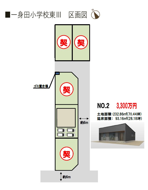 ■トレステージ一身田小学校東Ⅲ概要 ●所在地/三重県津市一身田大古曽字深田42-6他 ●交通/近鉄名古屋線「高田本山」駅自転車約6分●地目/宅地 ●用途地域/第1種低層住居専用地域●建ぺい率/60%●容積率/100%●道路幅員/南西側公道幅員(約6.1m) ●下水/個別浄化槽 ●雨水/側溝排水 ●電気・上水道/中部電力(オール電化)、公営水道 ●総区画数/5区画 ●販売戸数/一戸建:1戸 ●土地面積/232.86㎡●建物面積/93.16㎡ ●販売価格/3,300万円 ●入居時期/相談 ●取引態様/売主