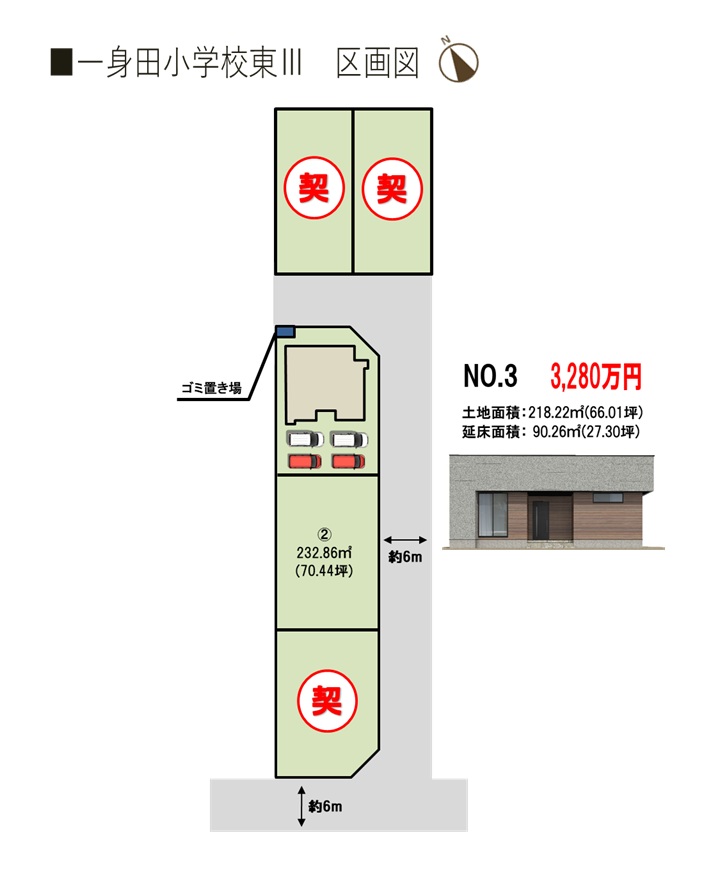 ■トレステージ一身田小学校東Ⅲ概要 ●所在地/三重県津市一身田大古曽字深田42-6他 ●交通/近鉄名古屋線「高田本山」駅自転車約6分●地目/宅地 ●用途地域/第1種低層住居専用地域●建ぺい率/60%●容積率/100%●道路幅員/南西側公道幅員(約6.1m) ●下水/個別浄化槽 ●雨水/側溝排水 ●電気・上水道/中部電力(オール電化)、公営水道 ●総区画数/5区画 ●販売戸数/一戸建:1戸 ●土地面積/218.22㎡●建物面積/ 90.26㎡●販売価格/3,280万円 ●入居時期/即入居可 ●取引態様/売主