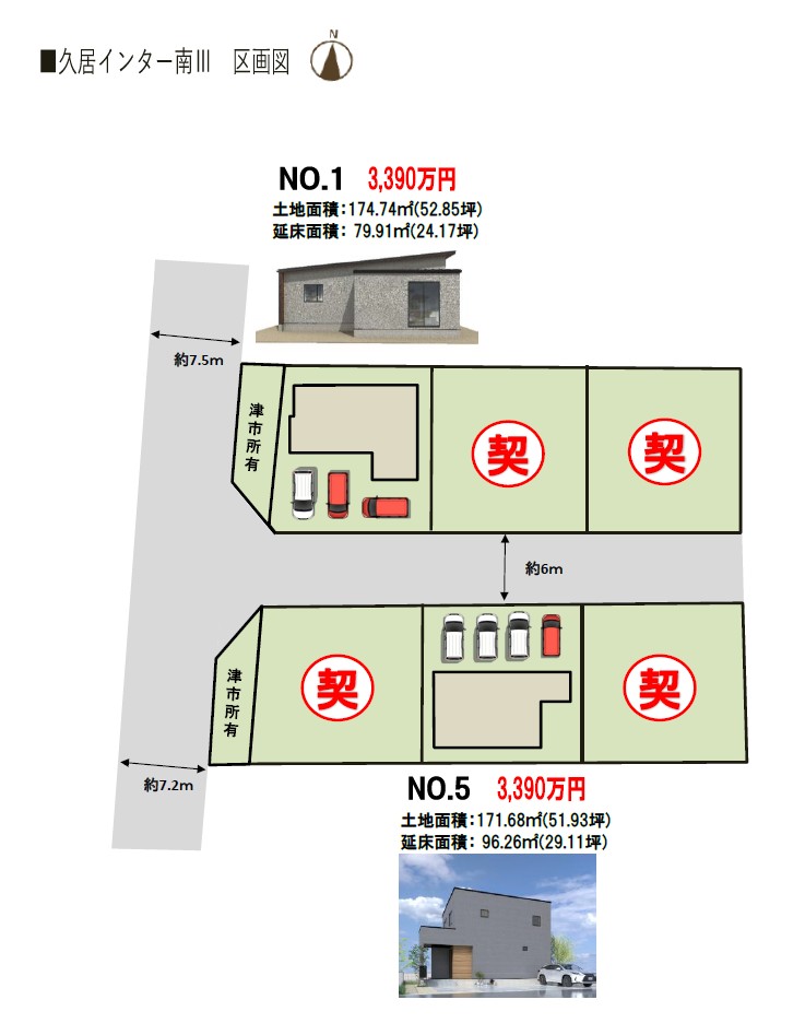 ■トレステージ久居インター南Ⅲ概要 ●所在地/三重県津市戸木町字東出7010-5他 ●交通/近鉄名古屋線「久居」駅自転車約13分●地目/宅地 ●用途地域/第1種住居地域●建ぺい率/60%●容積率/200%●道路幅員/北側公道幅員(約6.0m) ●下水/本下水 ●雨水/側溝排水 ●電気・上水道/中部電力(オール電化)、公営水道 ●総区画数/6区画 ●販売戸数/一戸建:2戸 ●土地面積/171.68㎡ ~174.74㎡●建物面積/ 96.26㎡~79.91㎡●販売価格/3,390万円 ●入居時期/即入居可 ●取引態様/売主