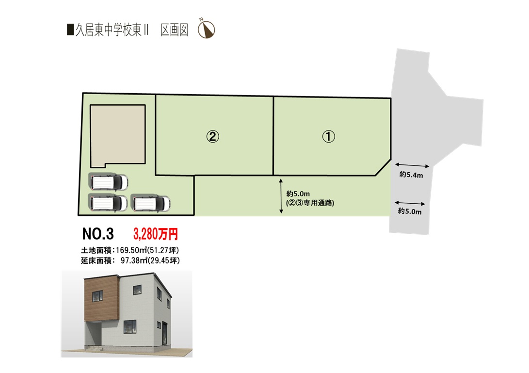 ■トレステージ久居東中学校東Ⅱ概要 ●所在地/三重県津市高茶屋小森町字三軒家1669他 ●交通/近鉄名古屋線「久居」駅自転車約9分●地目/宅地 ●用途地域/第1種住居地域●建ぺい率/60%●容積率/200%●道路幅員/東側公道幅員(約5.0m)団地内道路幅員(約5.0m) ●下水/本下水 ●雨水/側溝排水 ●電気・上水道/中部電力(オール電化)、公営水道 ●総区画数/3区画 ●販売戸数/一戸建:未定 ●土地面積/169.50㎡ ●建物面積/97.38㎡ ●販売価格/3,280万円 ●入居時期/相談 ●取引態様/売主