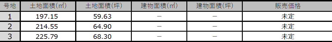 ■トレステージ久居烏木Ⅳ概要 ●所在地/三重県津市久居烏木町474番4他●交通/近鉄名古屋線「久居」駅・・・約1km(徒歩約13分)●地目/宅地 ●用途地域/第1種低層住居地域●建ぺい率/50%●容積率/80%●道路幅員/東側公道幅員(約5.8m)、南側公道幅員(約6m) ●下水/本下水 ●雨水/側溝排水 ●電気・上水道/中部電力(オール電化)、公営水道 ●総区画数/3区画 ●販売戸数/一戸建:未定 ●土地面積/197.15㎡~225.79㎡●建物面積/未定●販売価格/未定 ●入居時期/相談 ●取引態様/売主