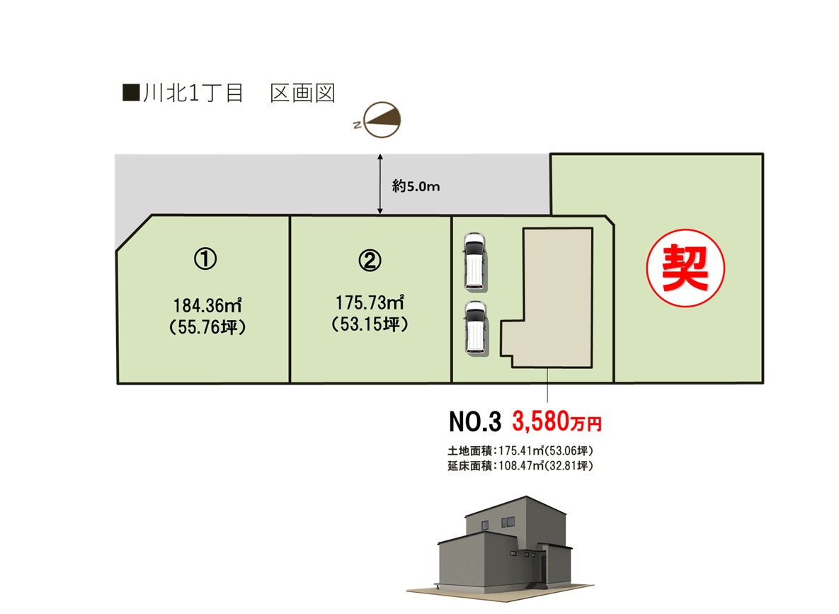 ■トレステージ川北1丁目概要 ●所在地/三重県四日市市川北一丁目115番6他 ●交通/近鉄名古屋線「川越富洲原」駅徒歩約22分(約1.7㎞)●地目/宅地 ●用途地域/第1種住居地域●建ぺい率/60%●容積率/200%●道路幅員/北側公道幅員(約5.0m) ●公共下水 ●雨水/側溝排水 ●電気・上水道/中部電力(オール電化)、公営水道 ●総区画数/4区画 販売戸数/一戸建:1戸 ●土地面積/175.41㎡~249.33㎡ ●建物面積/108.47㎡●販売価格/3,680万円●入居時期/即入居可 ●取引態様/売主