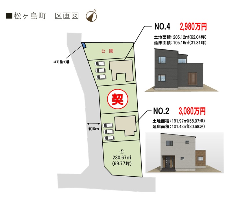 ■トレステージ松ヶ島町概要 ●所在地/三重県松阪市新松ヶ島町字小寄163-6他 ●交通/近鉄山田線「松ヶ崎」駅徒歩約10分●地目/宅地 ●用途地域/準工業地域●建ぺい率/60%●容積率/200%●道路幅員/南西側公道幅員(約6.0m) ●下水/個別浄化槽 ●雨水/側溝排水 ●電気・上水道/中部電力(オール電化)、公営水道 ●総区画数/4区画 ●販売戸数/一戸建:2戸 ●土地面積/191.97㎡~205.12㎡ ●建物面積/101.43㎡~105.16㎡ ●販売価格/2,980万円~3,080万円 ●入居時期/即入居可 ●取引態様/売主