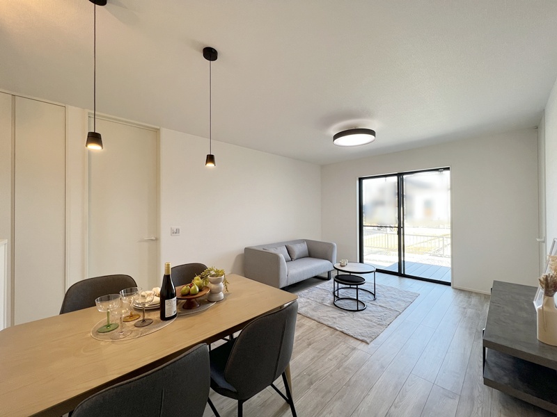 16帖のLDK を配置。隣接するウッドデッキとつなげることで、室内外に広がりを持たせ、家族が集まりやすい空間になっています。