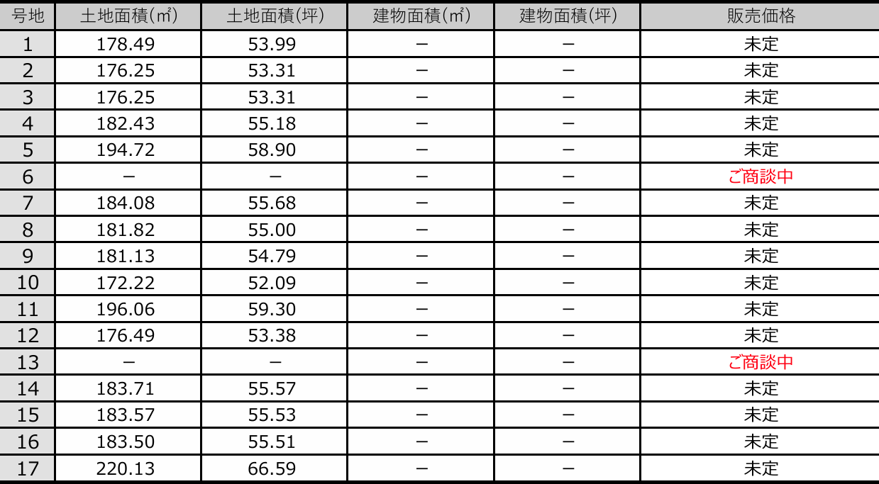 ■トレステージ益生駅南概要 ●所在地/三重県桑名市大字安永70-3他●交通/近鉄名古屋線「益生」駅・・・約1km(徒歩約13分)●地目/宅地 ●用途地域/第1種住居地域●建ぺい率/60%●容積率/200%●道路幅員/団地内道路公道幅員(約4.0m~6.0m) ●下水/個別浄化槽●雨水/側溝排水 ●電気・上水道/中部電力(オール電化)、公営水道 ●総区画数/17区画 ●販売戸数/一戸建:未定 ●土地面積/172.22㎡~220.13㎡●建物面積/未定●販売価格/未定 ●入居時期/相談 ●取引態様/売主 ●開発許可番号/第15070001-350-01号