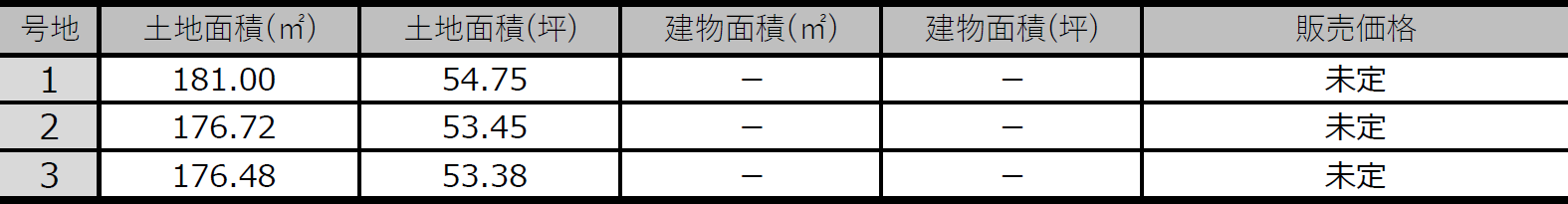 ■トレステージ立成小東Ⅱ概要 ●所在地/三重県津市久居野村町字八丁810番9他●交通/三重交通バス「市営野村団地」停徒歩約2分 近鉄名古屋線「久居」駅自転車約8分●地目/宅地 ●用途地域/第1種低層住居地域、第1種住居地域●建ぺい率/60%●容積率/200%●道路幅員/東側公道幅員(約4.0m) ●下水/本下水 ●雨水/側溝排水 ●電気・上水道/中部電力(オール電化)、公営水道 ●総区画数/3区画 ●販売戸数/一戸建:未定 ●土地面積/176.48㎡~181.00㎡●建物面積/未定●販売価格/未定 ●入居時期/相談 ●取引態様/売主
