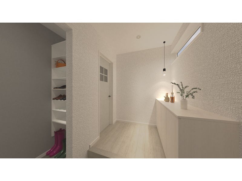 玄関には土間収納を設け、外で使う物や靴をすっきり収納。室内へ入るとすぐに物入れがあり、バッグや日用品なども片付けやすい動線です。