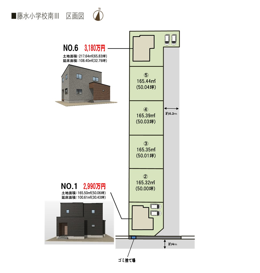 トレステージ藤水小学校南Ⅲ概要 ●所在地/三重県津市藤方字内浜田1400-1他 ●交通/JR紀勢本線「阿漕」駅自転車約13分●地目/宅地 ●用途地域/第2種低層住居専用地域●建ぺい率/60%●容積率/100%●道路幅員/①号地 南側公道幅員(約5.5m)⑥号地 南側公道幅員(約6.0m)●下水/個別浄化槽 ●雨水/側溝排水 ●電気・上水道/中部電力(オール電化)、公営水道 ●総区画数/6区画 ●販売戸数/一戸建:2戸 ●土地面積/165.32㎡ ~217.64㎡●建物面積/100.61㎡・108.40㎡●販売価格/2,990万円~3,180万円 ●入居時期/即入居可 ●取引態様/売主