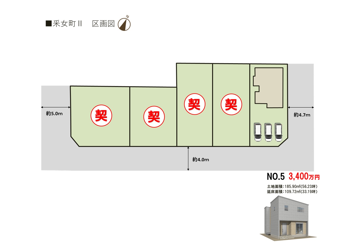 ■トレステージ釆女町Ⅱ概要 ●所在地/三重県四日市市釆女町110-7 ●交通/四日市あすなろう鉄道内部線「内部」駅徒歩約5分(約400m)●地目/宅地 ●用途地域/第2種中高層住居専用地域●建ぺい率/60%●容積率/160% ●道路幅員/南側公道幅員(約4.0m)、東側幅員(約4.7m) ●公共下水 ●雨水/側溝排水 ●電気・上水道/中部電力(オール電化)、公営水道 ●総区画数/4区画 ●販売戸数/一戸建:1戸 ●土地面積/185.90㎡ ●建物面積/109.72㎡ ●販売価格/3,400万円●入居時期/相談 ●取引態様/売主