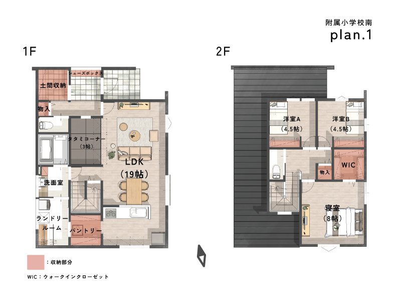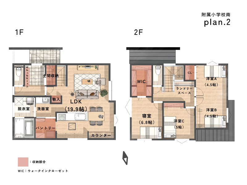 ウォークインクローゼットや各居室収納に加え、収納スペースをバランスよく配置。日用品や季節物も整理しやすく、すっきりと暮らせる住まいです。