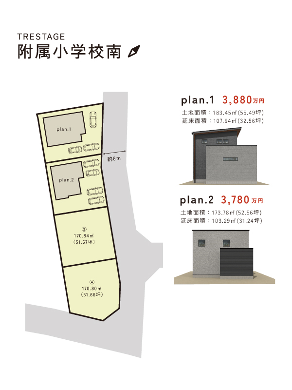 ■トレステージ附属小学校南概要 ●所在地/三重県津市鳥居町147番6他●交通/近鉄名古屋線「津」駅・・・約1400m(徒歩約18分)●地目/宅地 ●用途地域/第1種住居地域●建ぺい率/60%●容積率/200%●道路幅員/北側道路公道幅員(約6.0m)東側道路公道幅員 (約6.0m) ●下水/個別浄化槽(合併)●雨水/側溝排水 ●電気・上水道/中部電力(オール電化)、公営水道 ●総区画数/4区画 ●販売戸数/一戸建:2戸 ●土地面積/170.80㎡~183.45㎡●建物面積/103.29㎡~107.64㎡ ●販売価格/3,780万円~3,880万円 ●入居時期/相談 ●取引態様/売主