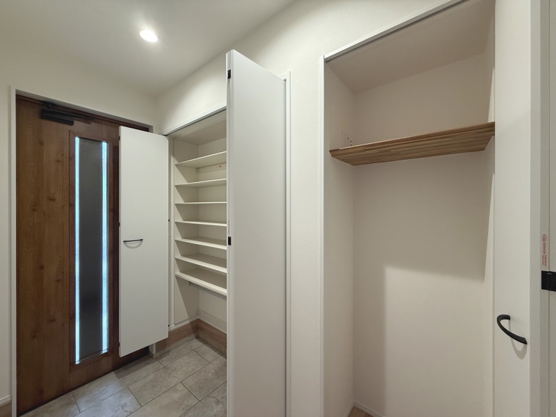 - シューズクローゼットや物入を設けることで、玄関まわりの収納力を確保。帰宅後すぐに片付けができ、すっきりとした空間を保てます。