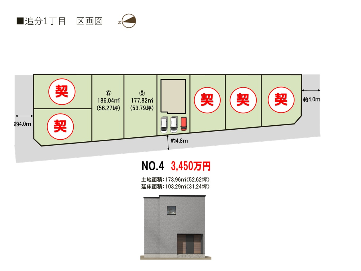 ■トレステージ追分1丁目概要 ●所在地/三重県四日市市追分一丁目2328番12他 ●交通/四日市あすなろう鉄道内部線「追分」駅徒歩約5分(約350m)●地目/宅地 ●用途地域/第1種住居地域●建ぺい率/60%●容積率/193.6%●道路幅員/西側公道幅員(約4.8m)、南側公道幅員(約4.0m) ●公共下水 ●雨水/側溝排水 ●電気・上水道/中部電力(オール電化)、公営水道 ●総区画数/8区画 ●販売戸数/一戸建:1戸 ●土地面積/173.96㎡ ●建物面積/103.29㎡ ●販売価格/3,450万円 ●入居時期/即入居可 ●取引態様/売主