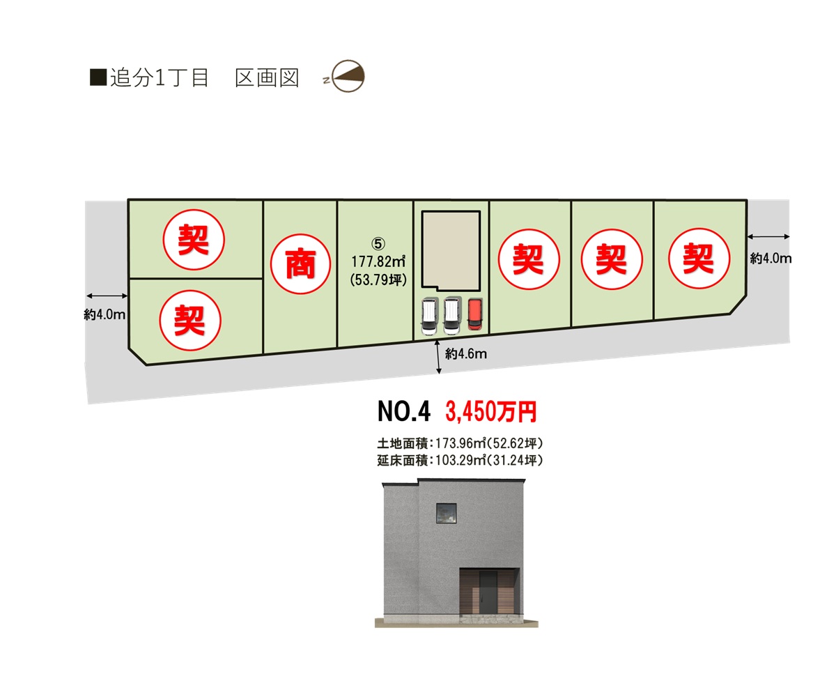 ■トレステージ追分1丁目概要 ●所在地/三重県四日市市追分一丁目2328番12他 ●交通/四日市あすなろう鉄道内部線「追分」駅徒歩約5分(約350m)●地目/宅地 ●用途地域/第1種住居地域●建ぺい率/60%●容積率/184%●道路幅員/西側公道幅員(約4.6m) ●公共下水 ●雨水/側溝排水 ●電気・上水道/中部電力(オール電化)、公営水道 ●総区画数/8区画 ●販売戸数/一戸建:1戸 ●土地面積/173.96㎡ ●建物面積/103.29㎡ ●販売価格/3,450万円 ●入居時期/即入居可 ●取引態様/売主