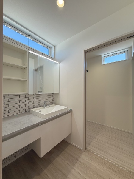 キッチン・洗面・脱衣を一直線に配置した、水まわり集約動線。入浴・洗濯・身支度がスムーズに行え、朝夕の混み合う時間帯も効率的に使えます。