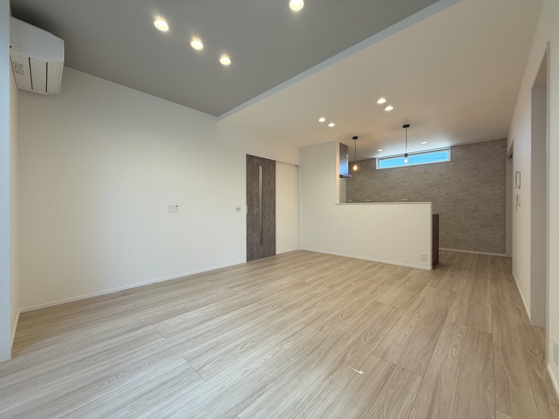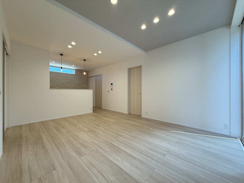 家族が自然と集まるLDKは、キッチンから全体を見渡せる配置。